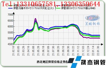 一月份(1.01-1.31),西北地區(qū)焊管鍍鋅管價(jià)格繼續(xù)下跌。云商平臺監(jiān)測數(shù)據(jù)顯示,截至2022年1月31日,西安地區(qū)4寸(3.75mm)焊管價(jià)格為5000-5030元,與上月同期價(jià)格持平;蘭州地區(qū)4寸(3.75mm)焊管價(jià)格為5150-5170元,比上月同期價(jià)格下跌50元;銀川地區(qū)4寸(3.75mm)焊管價(jià)格為5130-5150元,比上月同期下跌50元;烏魯木齊地區(qū)4寸(3.75mm)焊管價(jià)格為5190-5270元,比上月同期下跌50元。西安地區(qū)4寸(3.75mm)鍍鋅管價(jià)格為5900-6070元,比上月同期價(jià)格下跌140-240元;蘭州地區(qū)4寸(3.75mm)鍍鋅管價(jià)格為5880-6000元,比上月同期價(jià)格下跌50元;銀川地區(qū)4寸(3.75mm)焊管價(jià)格為5940-6000元,比上月同期下跌50元;烏魯木齊地區(qū)4寸(3.75mm)焊管價(jià)格為6260-6280元,比上月同期上漲40元。