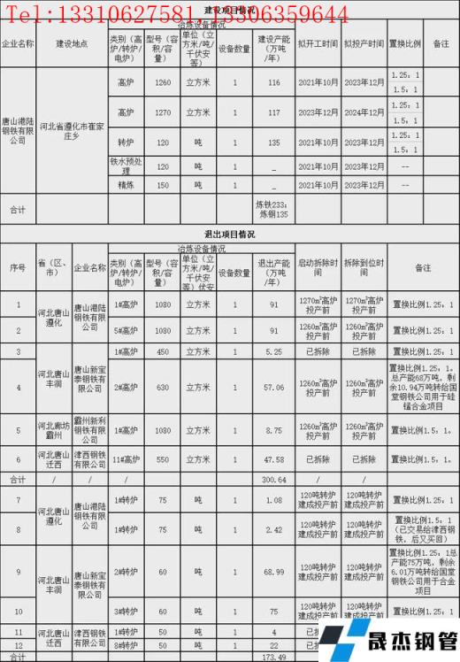 唐山港陸鋼鐵有限公司退出1080m3高爐2座、退出產能182萬噸;75t轉爐2座,退出產能3.5萬噸/年;唐山新寶泰鋼鐵有限公司450m3高爐1座,退出產能5.25萬噸/年;630m3高爐1座,退出產能57.06萬噸/年;60t轉爐2座,退出產能143.99萬噸/年;霸州新利鋼鐵有限公司1080m3高爐1座,退出產能8.75萬噸/年;津西鋼鐵有限公司退出550m3高爐1座,退出產能47.58萬噸/年;50t轉爐2座,退出產能26萬噸/年。共計退出煉鐵產能300.64萬噸,煉鋼產能173.49萬噸,所有項目將于新建項目建成投產前拆除。