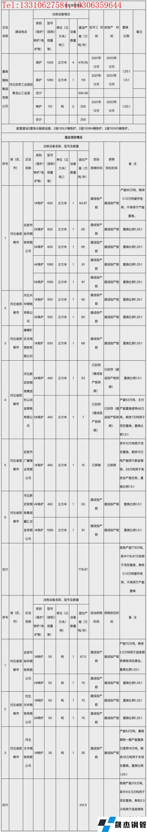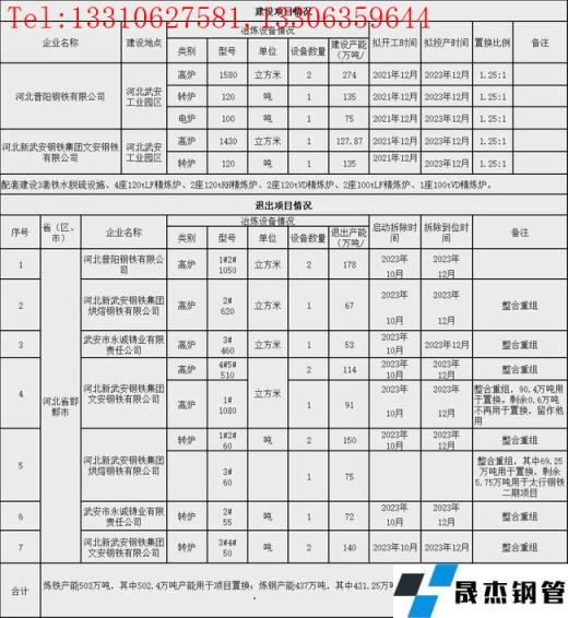 河北普陽鋼鐵有限公司退出高爐1050m3高爐2座,退出產能178萬噸/年。河北新武安鋼鐵集團烘熔鋼鐵有限公司退出620m3高爐1座,退出產能67萬噸/年;退出60t轉爐3座,產能225萬噸/年。武安市永誠鑄業有限責任公司退出460m3高爐1座,退出產能53萬噸/年;退出55t轉爐1座,產能72萬噸/年。河北新武安鋼鐵集團文安鋼鐵有限公司退出510m3高爐2座,退出產能114萬噸/年;退出1080m3高爐1座,退出產能91萬噸/年;退出50t轉爐2座,產能140萬噸/每年。共計退出煉鐵產能503萬噸,其中502.4萬噸產能用于項目置換;退出煉鋼產能437萬噸,其中431.25萬噸產能用于項目置換,所有項目將于2023年10月前拆除。