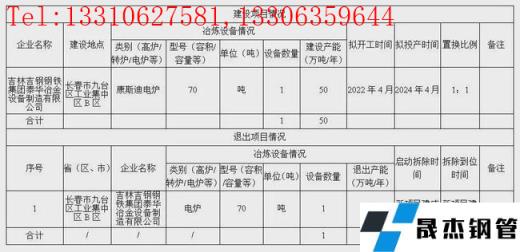 吉林吉鋼鋼鐵集團泰華冶金設備制造有限公司擬于2022年4月在長春市九臺區工業集中區B區新建70t康斯迪電爐1座,產能50萬噸/年,項目預計2024年4月投產。同時計劃退出70t電爐1座,產能50萬噸/年,預計在新項目投產前拆除。