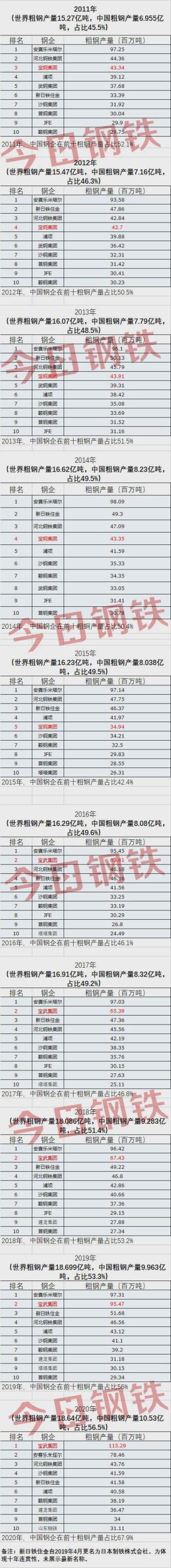 看到這樣的一份成績單,筆者也是深受震撼!為了能夠呈現中國寶武(前身寶武集團)的階段性跨越發展,筆者選取了世界鋼鐵協會2011至2020年前十位鋼企粗鋼產量進行了匯總(僅作為分析示意使用,未參考其他渠道或機構相關排行和產量數據)。通過透視十年間的粗鋼產量演變發展數據,對中國寶武(前身寶鋼集團)的十年發展歷史進行了回顧!這是一段中國鋼鐵業趕超發展的歷史,也是中國寶武從前列到峰巔的記錄!