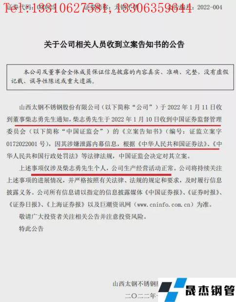 1月12日晚間,“不銹鋼龍頭”太鋼不銹發布公告稱,公司于2022年1月11日收到董事柴志勇先生通知,柴志勇先生于2022年1月10日收到中國證券監督管理委員會的《立案告知書》(編號:證監立案字0172022001號),因其涉嫌泄露內幕信息,根據相關法律法規,中國證監會決定對其立案。
