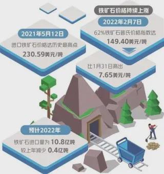 中國鐵礦石價格指數監測顯示,62%鐵礦石直進月均價已從2021年11月94.57美元/噸,升至2022年2月均價148.27美元/噸,2022年2月10日單日價格達到152.46美元/噸。