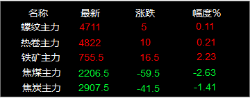 螺紋主力期貨漲5,收報4711,漲幅0.11%;熱卷主力漲10,收報4822,漲幅0.21%;焦煤主力跌59.5,收報2206.5,跌幅2.63%;焦炭主力跌41.5,收報2907.5,跌幅1.41%;鐵礦石主力漲16.5收報755.5,漲幅2.23%。唐山鋼坯昨日穩,現報4440元/噸,網優廢鋼統計21日2漲4跌,今早2漲5跌。