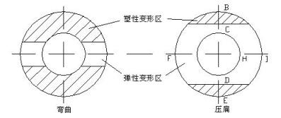 橫向壓扁及通過疊加橢圓壓扁變形來達到矯直的目的。在矯直截面中產(chǎn)生如圖8-9中BCDE的塑性區(qū)。這對矯直效果是非常重要的,因為彎曲矯直不能使截面全部為塑性區(qū),利用壓扁變形來補償。另外,對局部彎曲、管端彎曲、縱向彎曲矯直效果很差,必須是縱向彎曲和壓扁的共同作用才能達到滿意的矯直效果。(注:提高厚壁鋼管壁厚精度可提高厚壁鋼管的抗壓