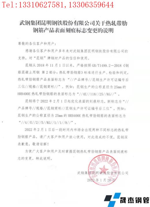 為使廣大客戶和用戶及時(shí)掌握昆鋼熱軋帶肋鋼筋產(chǎn)品表面刻痕標(biāo)志的變更,特此說明。