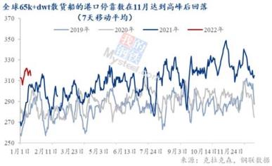近三個月來,因為所有型船需求疲軟,截止2022年1月24日,波羅的海干散貨運價指數連續第十二個交易日下滑至1391點,為去年2月以來最低水準。其中海岬型船運價指數下跌140點至891點,為20年6月中旬以來新低。巴西圖巴朗—中國青島的鐵礦石運價跌至17.28美金/噸,同比下降12%;西澳至青島的鐵礦石運價也僅為6.79美金/噸。