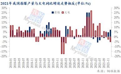 煤炭在供應大幅增產下,國內需求同比下降。與2020年12月同期相比,去年12月下游需求明顯高位回落,電力生產同比下降。12月,發電7234億千瓦時,同比下降2.1%,11月為同比增長0.2%,降幅明顯擴大。其中火力發電12月同比下降近5%。