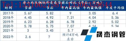 2021年鋼坯價格全年價格雖處于近三年高位水平,但因原燃料價格的持續攀高,唐山普方坯調研毛利均寬幅調整,均值約為380元/噸。而12月份以來價格剛剛扭虧為盈,無縫厚壁鋼管廠家仍存挺價情緒。另外由于環保限產30-50%帶來的實際成本上升120元/噸左右。據統計:截至1月27日,唐山地區主流樣本無縫厚壁鋼管廠家平均鐵水不含稅成本為3230元/噸,平均鋼坯含稅成本4261元/噸,周環比上調54元/噸,與目前普方坯出廠價格4500元/噸相比,無縫厚壁鋼管廠家平均毛利潤239元/噸。鋼坯利潤低位,無縫厚壁鋼管廠家挺價意愿較強,且節后原燃料市場預期向好,鋼坯成本端存在有力支撐。