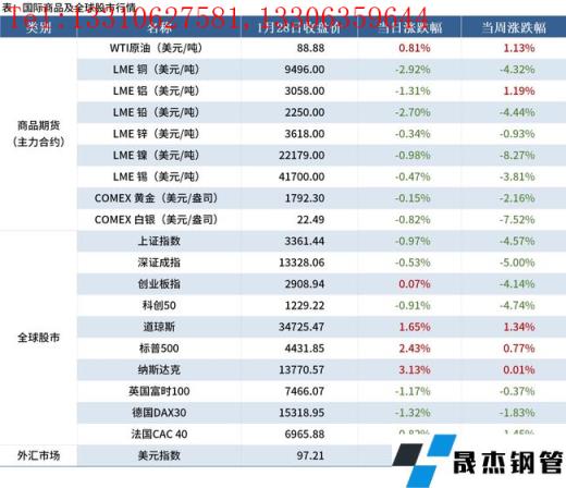 金融市場:本周主要商品期貨品種多下跌,其中黃金大跌8.27%;全球股市中,中歐股市基本下跌,美國股市跌后反彈;美元指數97.21,上漲1.65%。