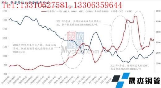 2)而2021年雖沒有再出現2020年4季度集中大幅去產能的情況。但仍出現了2021年三季度焦炭價格大漲1600元/噸的情形,兩個半月漲幅48%,漲幅明顯高于2020年四季度。這主要是由于焦煤供應受限導致的煤價大漲推升焦炭成本大幅上漲,以呂梁低硫主焦煤來看,其價格從6月底至9月底漲了一倍(2050-4100元/噸),焦炭供應矛盾從產能約束轉移至原料供應受限。同樣的,2021年四季度后,國家出臺煤炭保供政策,原料供應大幅緩解,同時需求端鐵水產量大減,最終傳導至焦煤價格大跌,焦炭價格應聲回落1600元/噸。