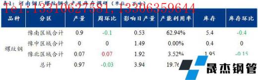 1、調研數據顯示,統計的河南地區10家建筑厚壁無縫鋼管樣本無縫厚壁鋼管廠家中,河南省建材無縫厚壁鋼管廠家螺紋鋼日產量0.97萬噸;檢修/限產影響建材日產量為3.94萬噸,產能利用率為19.76%,較上周下降0.61%。