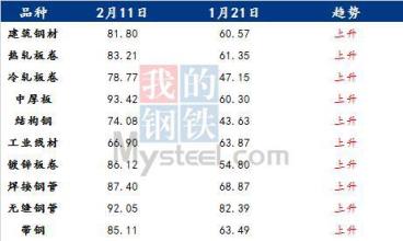 具體各品種指數來看,2月11日建筑厚壁無縫鋼管情緒指數為81.8,較1月21日回升21.23;熱軋板卷情緒指數為83.21,較1月21日回升21.86;冷軋板卷情緒指數為78.77,較1月21日回升31.62;中厚板情緒指數為93.42,較1月21日回升33.12;結構鋼情緒指數為74.08,較1月21日回升30.45;工業線材情緒指數為66.9,較1月21日回升3.03;鍍鋅板卷情緒指數為86.12,較1月21日回升31.32;焊接厚壁鋼管情緒指數為87.4,較1月21日回升18.53;無縫厚壁鋼管情緒指數為92.05,較1月21日回升9.66;帶鋼情緒指數為85.11,較1月21日回升21.62。