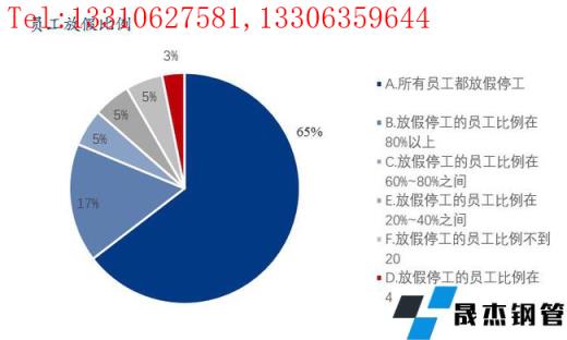 本次調研樣本企業中所有員工均放假的占比65%;放假停工的員工比例80%以上的占比17%;放假停工的員工比例60-80%的占比5%;放假停工的員工比例60%以下的僅有13%。