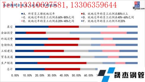 根據(jù)3805家企業(yè)的調(diào)研情況,今年用工和去年相比略微緊張一些。在崗員工較實(shí)際需要存在較大缺口(超過(guò)10%)的企業(yè)占比為10.35%,較去年上升了1個(gè)百分點(diǎn);在崗員工較實(shí)際需要存在一定缺口(5%-10%)的占比31.12%,較去年上升了2.5個(gè)百分點(diǎn);在崗員工與實(shí)際需要基本匹配的比例為54.01%,較去年同期下降了4.8個(gè)百分點(diǎn),在崗員工明顯超過(guò)實(shí)際需要(5%-10%)的比例為3.02%、在崗員工大幅超過(guò)實(shí)際需要(超過(guò)10%)的比例為1.50%。調(diào)研數(shù)據(jù)表明,今年鋼鐵行業(yè)企業(yè)用工有一定的缺口,節(jié)后多數(shù)企業(yè)可能擴(kuò)大人員規(guī)模;分類型來(lái)看,工程建筑也的用工缺口最大,其次為生產(chǎn)制造、金融投資兩個(gè)領(lǐng)域。