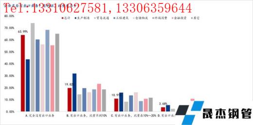 本地調(diào)研,我們還就企業(yè)是否有出口業(yè)務(wù)、出口業(yè)務(wù)比重有進(jìn)行了調(diào)研。 調(diào)研顯示,完全沒(méi)有出口業(yè)務(wù)的企業(yè)占比63.99%,有出口業(yè)務(wù),比重不到10%的企業(yè)占比19.82%,有出口業(yè)務(wù),比重在10%~20%的企業(yè)占比10.91%,有出口業(yè)務(wù),比重在20%~50%的企業(yè)占比3.68%,有出口業(yè)務(wù),比重在50%以上的占比只有1.60%。分行業(yè)來(lái)看,幾乎所有行業(yè)出口占比都比較低,其中生產(chǎn)企業(yè)整體要高于其他行業(yè)。