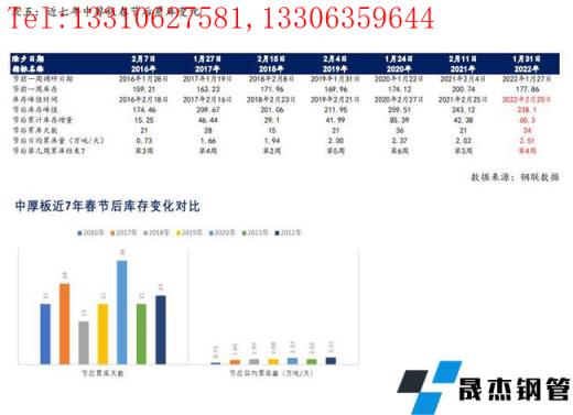 與螺紋鋼原因相對一致,2020年春節后累庫天數長達43天,節后第7周首次出現降庫趨勢。2016年至2019年,以及2021年,線材春節后累庫天數基本維持在21-35天,并在節后第3-5周首次出現降庫趨勢。依據建筑厚壁無縫鋼管品種屬性基本相似的慣例來看,2022年線材節后預計累庫天數也將達到30天左右,節后日均累庫9.72萬噸/天,同比2021年高24%左右,節后第4周達到峰值,庫存峰值同比低4%左右。