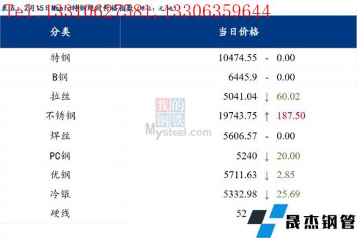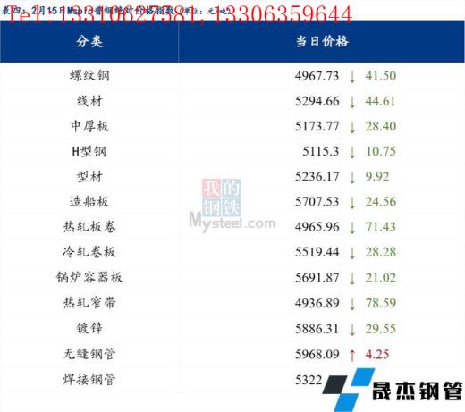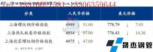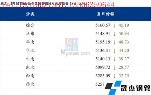 2月15日普鋼絕對價格指數變化:綜合指數5160.57,下跌45.19;螺紋鋼指數4967.73,下跌41.5;線材指數5294.66,下跌44.61;熱軋板卷指數4965.96,下跌71.43;冷軋板卷指數5519.44,下跌28.28;中厚板指數5173.77,下跌28.4。