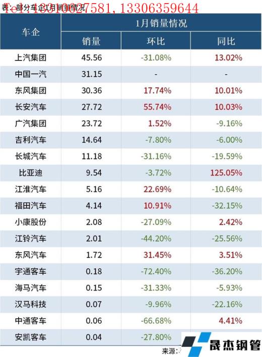 免責聲明:本網站(山東聊城晟杰無縫鋼管廠m.ahcom.com.cn)刊載的“1月我國汽車產銷降幅明顯,多數車企呈現雙位數下跌”等均源于網絡,版權歸原作者所有,且僅代表原作者觀點,本文所載信息僅供參考。轉載僅為學習與交流之目的,如無意中侵犯您的合法權益,請及時聯系刪除。本網站刊登此篇文章并不意味著本站贊同其觀點或證實其內容的真實性,我們不對其科學性、嚴肅性等作任何形式的保證。如果侵犯了您的版權,請盡快聯系我們予以撤銷,謝謝合作!