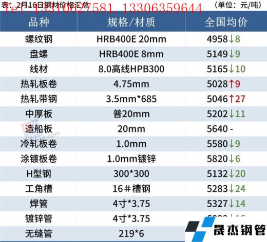 建筑厚壁無(wú)縫鋼管:2月16日,全國(guó)31個(gè)主要城市20mm三級(jí)抗震螺紋鋼均價(jià)4958元/噸,較上個(gè)交易日跌8元/噸。短期來(lái)看,隨著原料價(jià)格的走弱,需求持續(xù)低迷,市場(chǎng)悲觀情緒漸濃,貿(mào)易商低價(jià)套現(xiàn)操作較為普遍。元宵之后下游工地存在一定復(fù)工預(yù)期,但未來(lái)幾日又將持續(xù)雨水天氣,需求釋放力度仍有待考證,預(yù)計(jì)17日國(guó)內(nèi)建筑厚壁無(wú)縫鋼管價(jià)格或?qū)⒅沟蠓€(wěn)。