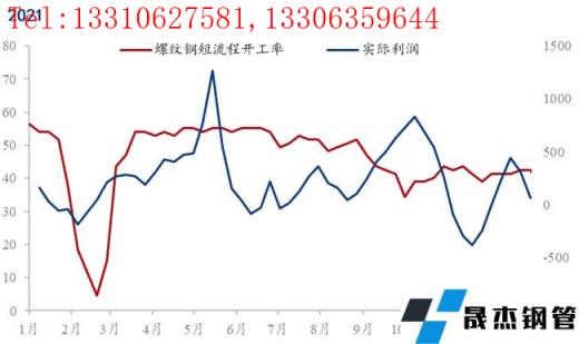 而對(duì)于2021年的數(shù)據(jù)來(lái)說(shuō)無(wú)論是相關(guān)分析還是回歸分析結(jié)果表現(xiàn)出與其他年份有不同的結(jié)果,這與2021年的特殊情況有關(guān)。由于2021年螺紋鋼價(jià)格的急劇變化,導(dǎo)致電弧爐實(shí)際利潤(rùn)具有了極強(qiáng)的波動(dòng)性,而且由于能耗雙控,從8月底電弧爐無(wú)縫厚壁鋼管廠(chǎng)家被嚴(yán)格限產(chǎn),導(dǎo)致了電弧爐開(kāi)工率有近20%左右的持續(xù)下降,創(chuàng)造了歷史低位,政策以及成材價(jià)格變動(dòng)明顯干擾了數(shù)據(jù)的觀(guān)測(cè),如下圖所示: