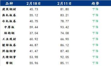 具體各品種指數(shù)來看,2月18日建筑厚壁無縫鋼管情緒指數(shù)為45.73,較2月11日回落36.07;熱軋板卷情緒指數(shù)為55.12,較2月11日回落28.09;冷軋板卷情緒指數(shù)為40.75,較2月11日回落38.02;中厚板情緒指數(shù)為59.44,較2月11日回落33.98;結(jié)構(gòu)鋼情緒指數(shù)為37.04,較2月11日回落37.04;工業(yè)線材情緒指數(shù)為60.92,較2月11日回落5.98;鍍鋅板卷情緒指數(shù)為46.87,較2月11日回落39.25;焊接厚壁鋼管情緒指數(shù)為41.47,較2月11日回落45.93;無縫厚壁鋼管情緒指數(shù)為53.98,較2月11日回落38.07;帶鋼情緒指數(shù)為55.96,較2月11日回落29.15。