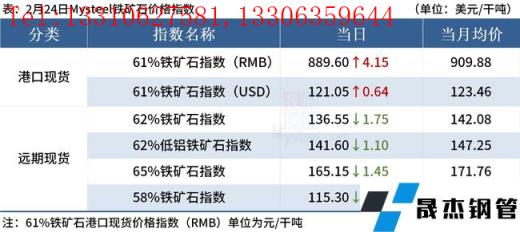 ◎2月24日統計新口徑114家無縫厚壁鋼管廠家進口燒結粉總庫存3317.49萬噸,燒結粉總日耗95.47萬噸。原口徑64家無縫厚壁鋼管廠家進口燒結粉總庫存1568.97萬噸,燒結粉總日耗47.32萬噸,庫存消費比33,燒結礦中平均使用進口礦配比86.39%,無縫厚壁鋼管廠家不含稅平均鐵水成本3107元/噸。詳情>>