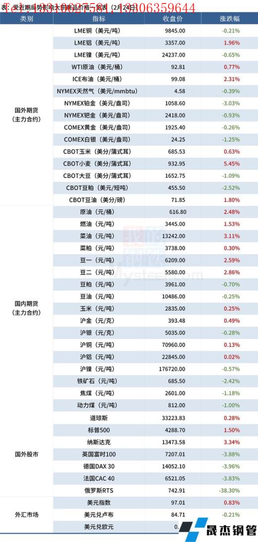 免責聲明:本網站(山東聊城晟杰無縫鋼管廠m.ahcom.com.cn)刊載的“受近期局勢影響大宗商品價格一覽表(2月24日)”等均源于網絡,版權歸原作者所有,且僅代表原作者觀點,本文所載信息僅供參考。轉載僅為學習與交流之目的,如無意中侵犯您的合法權益,請及時聯系刪除。本網站刊登此篇文章并不意味著本站贊同其觀點或證實其內容的真實性,我們不對其科學性、嚴肅性等作任何形式的保證。如果侵犯了您的版權,請盡快聯系我們予以撤銷,謝謝合作!