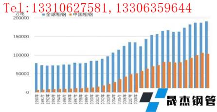 1990年-2021年全球和中國粗鋼產量走勢圖