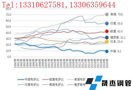 電爐鋼是以電力為能源、以再生鋼鐵料為原料的煉鋼爐生產的鋼。這種短流程煉鋼與以鐵礦石為主要原料的長流程煉鋼在原料使用上有本質的區別。從電爐鋼的占比情況看,中國粗鋼生產90%以上依賴長流程,即以鐵礦石為主要原料的生產方式,并且受制于國產鐵精礦的產量不足,對進口鐵礦石的依存度很高。截止到2020年,據世界鋼協(WSA)的統計數據,全球電爐鋼產量占比為26.1%。主要產鋼國中,美國為70.6%,土耳其為69.2%,印度電爐比為55.5%,歐盟(28)為42.4%,俄羅斯為32.1%,韓國為31.0%,日本為25.4%。中國電爐鋼占比在20世紀90年代曾超過20%,但由于之后中國長流程煉鋼規模迅速擴大,電爐鋼占比不斷被稀釋,至2020年已降至9.2%。從目前情況看,美國、印度和歐盟鋼鐵生產對鐵礦石依存度相對低很多。