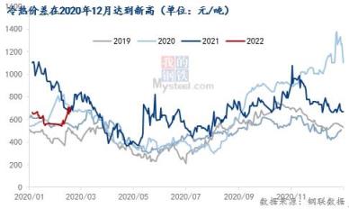 去年同期(2021年2月),由于汽車以及直接出口需求旺盛,冷軋強(qiáng)熱軋弱的局面明顯,冷軋總庫存累庫高度同比降幅達(dá)20%,冷熱價差也拉到新高,月均值達(dá)800元/噸以上。在去年同期冷軋“如火如荼”的行情襯托下,顯得今年的冷軋春天愈發(fā)“寒冷”。