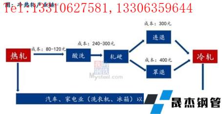 由于熱軋是冷軋的原料,調(diào)研了解有近40%的熱軋被用來(lái)生產(chǎn)冷軋,而且冷熱軋終端需求分布有部分重合,因此冷軋與熱軋價(jià)格走勢(shì)高度類似。冷軋板卷是以熱軋卷為原料,在室溫下經(jīng)過(guò)酸洗(費(fèi)用80-120元/噸)、軋制(費(fèi)用240-300元/噸),然后連退(費(fèi)用300元/噸)或罩退(費(fèi)用400元/噸)而成,冷軋成本較熱軋多出620-820元/噸。從下游需求分布來(lái)看,冷熱軋終端需求分布有部分重合,冷熱軋均被用于汽車、家電業(yè)(洗衣機(jī)、冰箱)以及產(chǎn)業(yè)設(shè)備等。