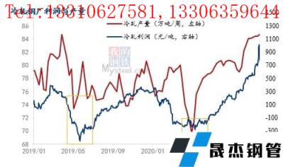 由于考慮到訂單、排產(chǎn)、后續(xù)市場(chǎng)情況等多種因素,無(wú)縫厚壁鋼管廠家生產(chǎn)計(jì)劃需提前制定,因此無(wú)縫厚壁鋼管廠家不會(huì)輕易減少產(chǎn)量。我們分析歷史情況發(fā)現(xiàn),在虧損較大后,冷軋產(chǎn)量才會(huì)有明顯的下降。由于2021年政策影響較大,我們選取2019-2020年冷軋無(wú)縫厚壁鋼管廠家的產(chǎn)量和利潤(rùn)情況發(fā)現(xiàn),產(chǎn)量最低的兩個(gè)時(shí)間點(diǎn)分別為2019年5月底以及2020年5月底,這兩個(gè)時(shí)間點(diǎn)對(duì)應(yīng)的冷軋利潤(rùn)也到達(dá)最低點(diǎn),分別為-450元/噸和-279元/噸。