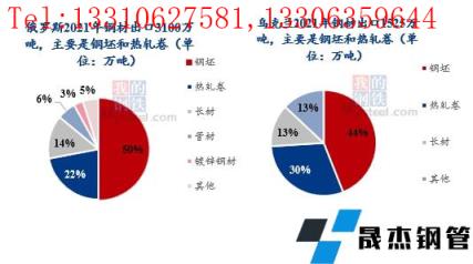 俄、烏均是產(chǎn)鋼大國(guó)和厚壁無(wú)縫鋼管主要出口國(guó),兩國(guó)主要出口產(chǎn)品均為鋼坯、熱軋卷、長(zhǎng)材。據(jù)世界鋼協(xié)統(tǒng)計(jì),2021年,俄、烏粗鋼產(chǎn)量分別為7600萬(wàn)噸和2140萬(wàn)噸,產(chǎn)量在全球排名第五和第十四位,分別占全球粗鋼總產(chǎn)量的3.9%和1.1%。