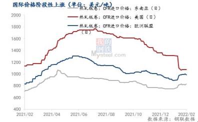 國(guó)際鋼價(jià)自俄烏沖突以來(lái)迎來(lái)了階段性上漲,截至2月28日,歐盟及東南亞進(jìn)口CFR價(jià)格月環(huán)比分別上漲100美元/噸和82美元/噸,另外美國(guó)進(jìn)口價(jià)格也在2月中下旬停止了下跌趨勢(shì)開(kāi)始企穩(wěn)。