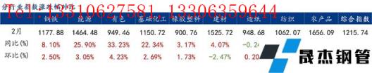 同比來看,2月份鋼鐵、能源、有色、基礎化工、橡膠塑料、建材、紡織、農產品等8個行業價格指數上漲。
