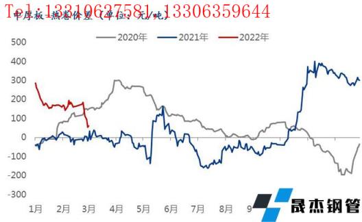 從品種價(jià)差方面的情況來看,2月份熱軋板卷與中厚板之間的價(jià)差為168.25元/噸,1月份熱軋板卷與中厚板之間的價(jià)差為196.94元/噸,價(jià)差縮小28.69元/噸;2021年同期數(shù)據(jù)為0.53元/噸,同比價(jià)差擴(kuò)大167.72元/噸。(備注:價(jià)差是指的中厚板價(jià)格減去熱軋板卷價(jià)格)具體情況如下圖所示: