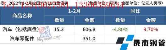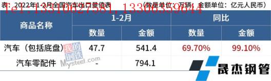 免責聲明:本網站(山東聊城晟杰無縫鋼管廠m.ahcom.com.cn)刊載的“海關總署:1-2月中國出口汽車47.7萬輛,同比增69.70%”等均源于網絡,版權歸原作者所有,且僅代表原作者觀點,本文所載信息僅供參考。轉載僅為學習與交流之目的,如無意中侵犯您的合法權益,請及時聯系刪除。本網站刊登此篇文章并不意味著本站贊同其觀點或證實其內容的真實性,我們不對其科學性、嚴肅性等作任何形式的保證。如果侵犯了您的版權,請盡快聯系我們予以撤銷,謝謝合作!
