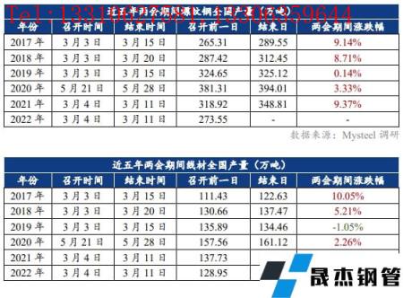近五年兩會期間建筑厚壁無縫鋼管價格基本呈現(xiàn)下行趨勢,2017年和2018年價格下行的主要原因是下游需求不振;2019年價格上漲的主要原因是限產(chǎn)加嚴(yán)導(dǎo)致供給偏低疊加下游需求恢復(fù)良好;2020年和2021年價格走低的主要原因是兩會期間建筑厚壁無縫鋼管產(chǎn)量高位運行,供大于求。今年兩會期間,產(chǎn)量和庫存都處于往年平均線之下,供應(yīng)量相對偏低,同時一季度市場需求不斷回暖,若需求恢復(fù)力度尚可,疊加國內(nèi)宏觀利好持續(xù)推進(jìn),預(yù)計“兩會期間”建筑厚壁無縫鋼管價格或?qū)⒗^續(xù)震蕩偏強運行。