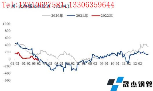 2月螺紋北京-沈陽月均價差+42元/噸,廣州-沈陽月均價差+33元/噸,上海-沈陽月均價差-89元/噸,濟南-沈陽月均價差+40元/噸。雖然本地尚未全面啟動,但本地無縫厚壁鋼管廠家跟漲節奏較快,帶動市場報價整體上漲,即東北價格繼續處在較高水平,南北無合適的價差已經成為常態。
