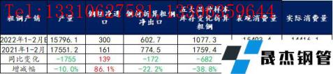 依據統計局發布數據,2022年1-2月累計粗鋼產量同比降幅約10%左右,絕對量達到1.6億噸,去年同期約為1.8億噸;受今年國外形勢變化,鋼坯預估凈進口同比增幅達到86%,厚壁無縫鋼管折算粗鋼凈出口降幅達到22%,因此測算粗鋼表觀消費量達到1.55億噸,同比降幅約8.6%;另外考慮到庫存變化因素,將其折算至粗鋼,測算粗鋼實際消費量達到1.44億噸,同比降幅約5%,需求降幅表現明顯好于市場預期。