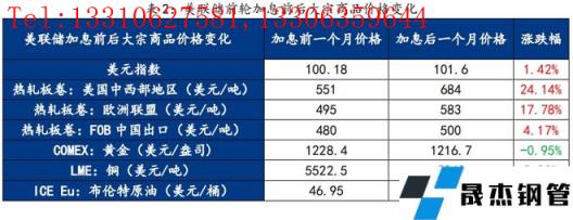 那么,在美聯(lián)儲歷史上進行加息的時間區(qū)間中,大宗商品價格都是如何變化的呢?選取了美聯(lián)儲第六輪加息期間(2016.12-2018.12)美元指數(shù)、熱軋板卷、黃金、銅、布倫特原油作為參考標(biāo)的進行分析,其中參考時間維度為2016年加息落地前一個月的交易日價格與加息落地后一個月的交易日價格(表2)。