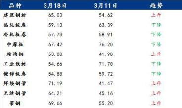 具體各品種指數(shù)來看,3月18日建筑厚壁無縫鋼管情緒指數(shù)為65.03,較3月11日回升10.41;熱軋板卷情緒指數(shù)為59.13,較3月11日回落4.26;冷軋板卷情緒指數(shù)為57.73,較3月11日回落1.18;中厚板情緒指數(shù)為67.42,較3月11日回落8.78;結(jié)構(gòu)鋼情緒指數(shù)為53.88,較3月11日回升11.9;工業(yè)線材情緒指數(shù)為54.66,較3月11日回落17.04;鍍鋅板卷情緒指數(shù)為54.88,較3月11日回落4.84;焊接厚壁鋼管情緒指數(shù)為71.19,較3月11日回升29.72;無縫厚壁鋼管情緒指數(shù)為64.21,較3月11日回升19.05;帶鋼情緒指數(shù)為69.66,較3月11日回升14.46。