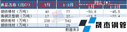 2月,中國(guó)出口鋼鐵棒材40萬(wàn)噸,同比下降50.8%;1-2月累計(jì)出口77萬(wàn)噸,同比下降45.5%。其他出口情況如下表所示: