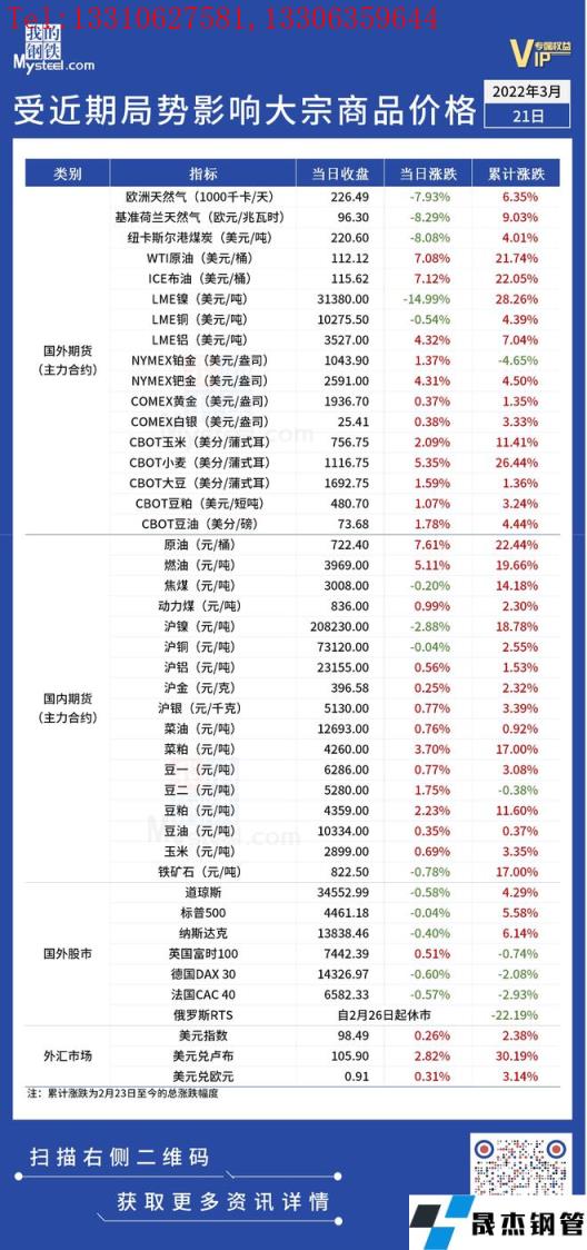近期,受國際局勢影響,全球金融及大宗商品市場出現(xiàn)較大波動。3月21日,倫鎳繼續(xù)跌停,國際原油重回110美元以上。匯總情況如下: