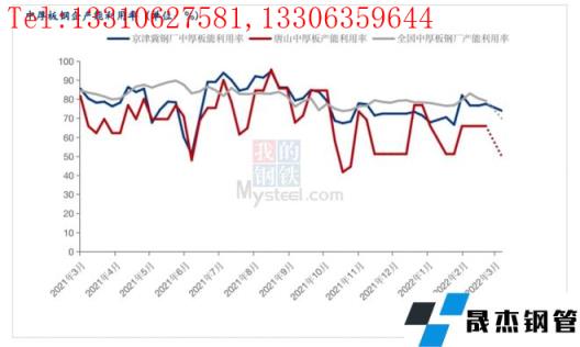 由于前期京津冀地區(qū)受到“2+26”座城市秋冬季限產(chǎn)、冬殘奧會限產(chǎn)等政策,產(chǎn)能利用率出現(xiàn)了明顯的下滑。隨著采暖季的結(jié)束以及東殘奧會的閉幕,鋼企的產(chǎn)能利用率出現(xiàn)了回升,截至3月18日,全國中厚板鋼企產(chǎn)能利用率79.13%,京津冀地區(qū)中厚板鋼企產(chǎn)能利用率77.55%,唐山地區(qū)中厚板鋼企產(chǎn)能利用率為65.53%,隨著3月19日唐山疫情突發(fā),無縫厚壁鋼管廠家的復(fù)產(chǎn)節(jié)奏與物流均受到了影響,當(dāng)下原料供給是當(dāng)下比較棘手的問題,短期內(nèi)爐料補(bǔ)給不足,鋼企被迫停產(chǎn)的可能性較大。預(yù)計3月底,唐山中厚板產(chǎn)能利用率或?qū)⒋蠓陆?,全國中厚板鋼企產(chǎn)能利用率預(yù)計在70%左右。