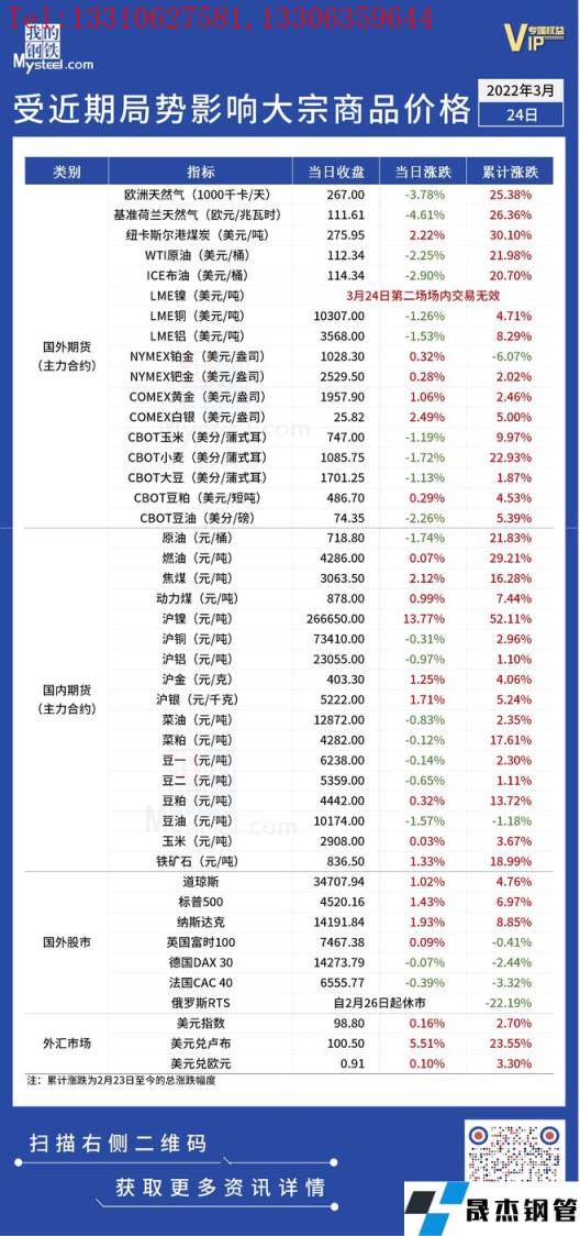 免責聲明:本網站(山東聊城晟杰無縫鋼管廠m.ahcom.com.cn)刊載的“受近期局勢影響大宗商品價格一覽表(3月24日)”等均源于網絡,版權歸原作者所有,且僅代表原作者觀點,本文所載信息僅供參考。轉載僅為學習與交流之目的,如無意中侵犯您的合法權益,請及時聯系刪除。本網站刊登此篇文章并不意味著本站贊同其觀點或證實其內容的真實性,我們不對其科學性、嚴肅性等作任何形式的保證。如果侵犯了您的版權,請盡快聯系我們予以撤銷,謝謝合作!