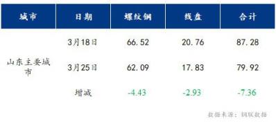 本周山東市場(chǎng)主要城市螺紋鋼社會(huì)庫存62.09萬噸,較上周下降4.43萬噸;盤螺社會(huì)庫存17.83萬噸,較上周下降2.93萬噸。