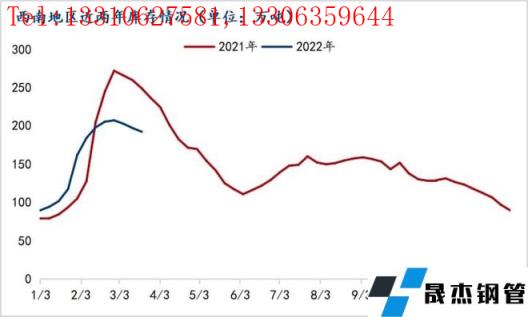 截至3月24日,西南地區建筑厚壁無縫鋼管社會庫存總量192.18萬噸,已經連續三周下降,庫存拐點基本顯現,庫存峰值于3月3日出現,為207.08萬噸,較去年庫存高點減少64.75萬噸,降幅達23.82%。主要原因是:1、西南地區價格全國洼地,北方無縫厚壁鋼管廠家對西南地區資源投放量大幅減少,尤其是川渝地區;2、廣東廣西等區域價格高企,云南無縫厚壁鋼管廠家維持低庫存運轉,加大對兩廣等周邊區域資源投放;3、受廢鋼不足、環保檢查、利潤低等因素影響,西南地區電爐企業春節放假時間較往年提前,總體產量下降;4、冬儲價格偏高,商家對春節后需求普遍擔憂,冬儲操作較為謹慎,冬儲體量較往年偏低。綜上原因,西南地區建筑厚壁無縫鋼管社會庫存較去年低。