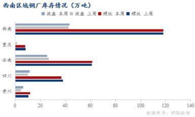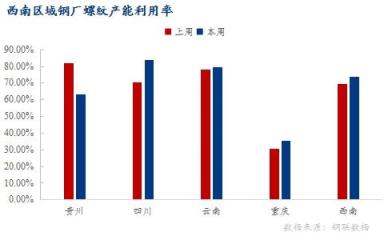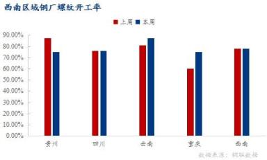 重慶區域:本周重慶區域螺紋鋼生產情況較上周無明顯變化,螺紋鋼產能利用率35.51%,環比增加4.67%;開工率75%,環比增加15%;周產量3.8萬噸,環比增加0.5萬噸。